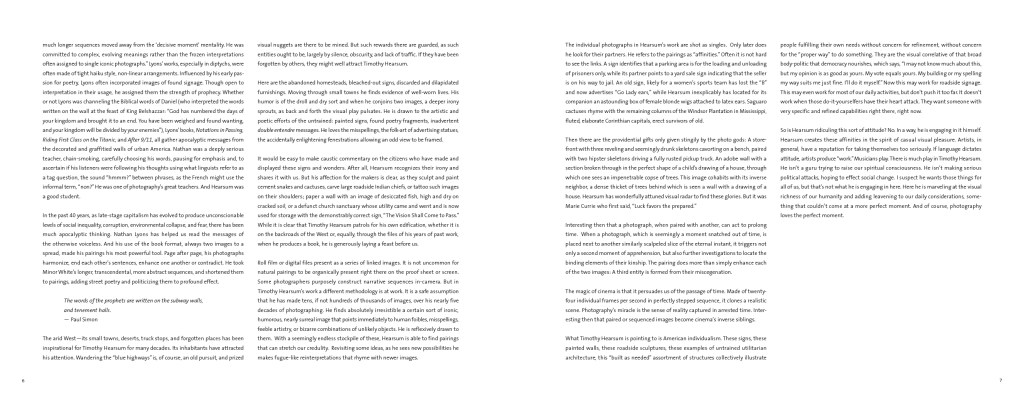 Timothy Hearsum sees the world around him from the perspective of a visual anthropologist as well as a photographer. His many travels along the back roads, side streets, and alleyways inform much of the visual language portrayed in this collection of photographs.