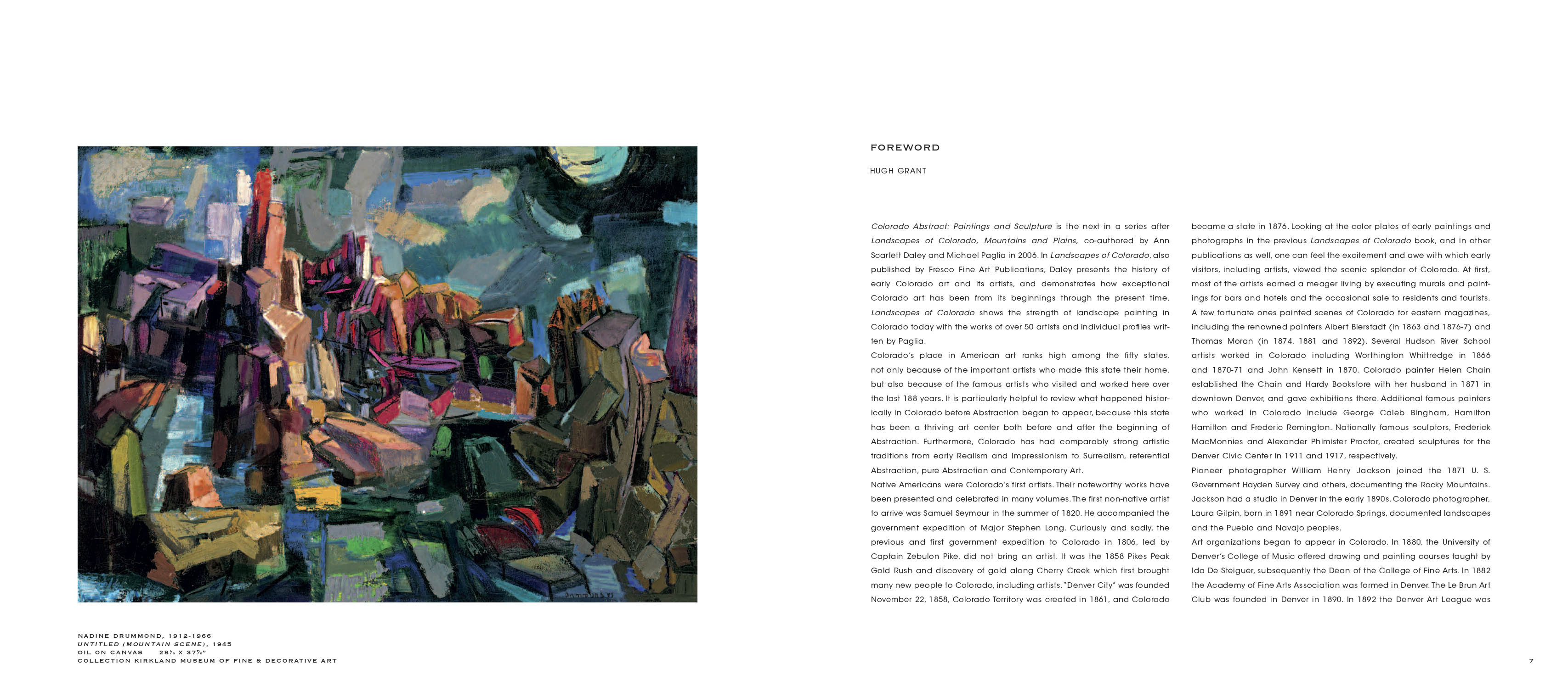 Hugh Grant established the Kirkland Foundation in 1996 to research, acquire, rediscover, and preserve the history of Colorado art. He has collected the works of over 170 Colorado artists who were active from 1880 to 1980. Director and curator of the Kirkland Museum of Fine and Decorative Art in Denver, Grant is adjunct curator of the Kirkland Collection at the Denver Art Museum.