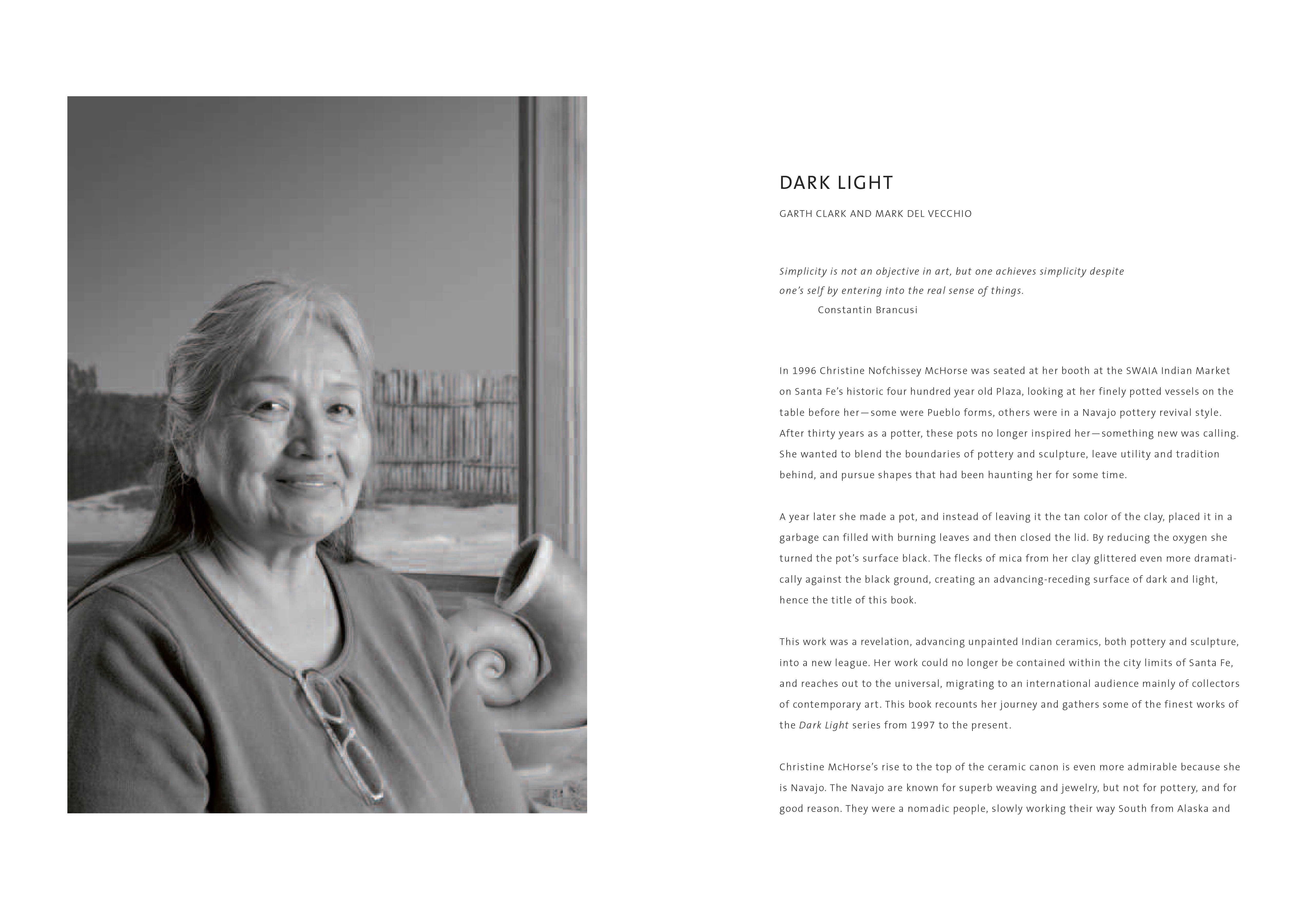 Dark Light is the first book on the ceramics of the great Navajo ceramist Christine Nofchissey McHorse and features her award-winning sculptural black series begun in 1998. Authors Clark and Del Vecchio, the two foremost experts on international contemporary ceramics, give respect to the artist’s Native roots while also exploring her art in a mainstream context, a breakthrough in evaluating Indian pottery today.