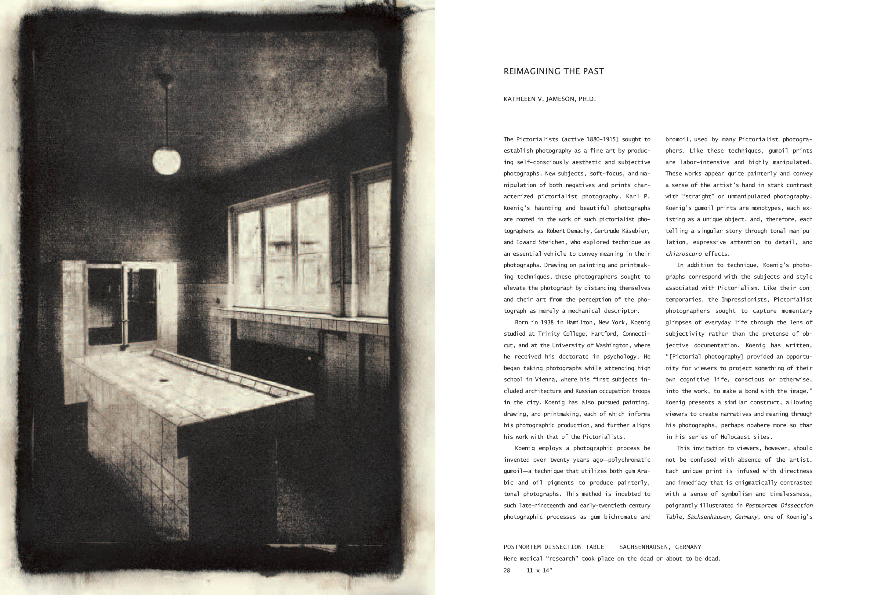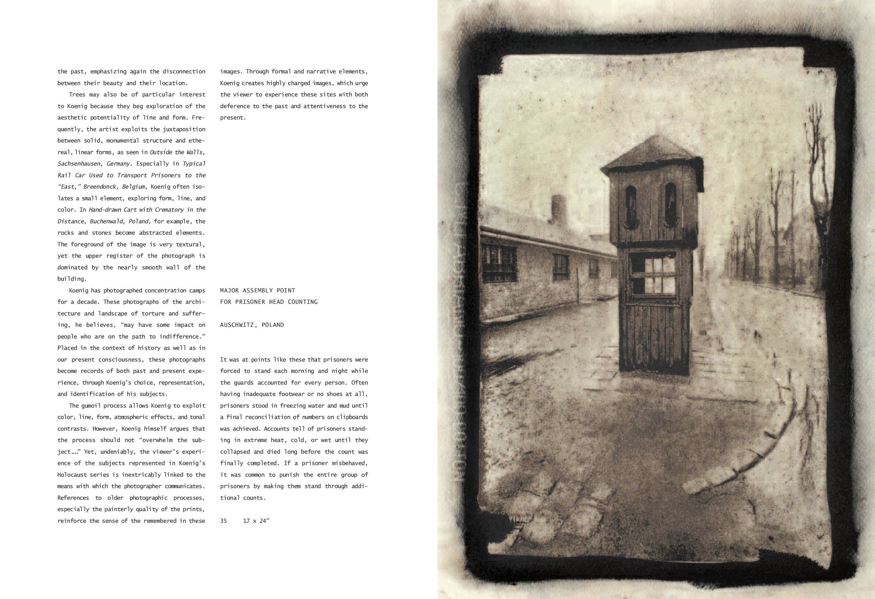Karl Koenig has been photographing Holocaust concentration camps for more than ten years. These photographs of the architecture and landscape of suffering, he believes, “may have some impact on people who are on the path to indifference.” Throughout the series, Koenig explores narrative and visual dissonances in order to highlight the inexplicability of the Holocaust itself. Inventor of the polychromatic gumoil process, a labor-intensive and highly manipulated method, Koenig creates monotypes, each existing as an unique object.