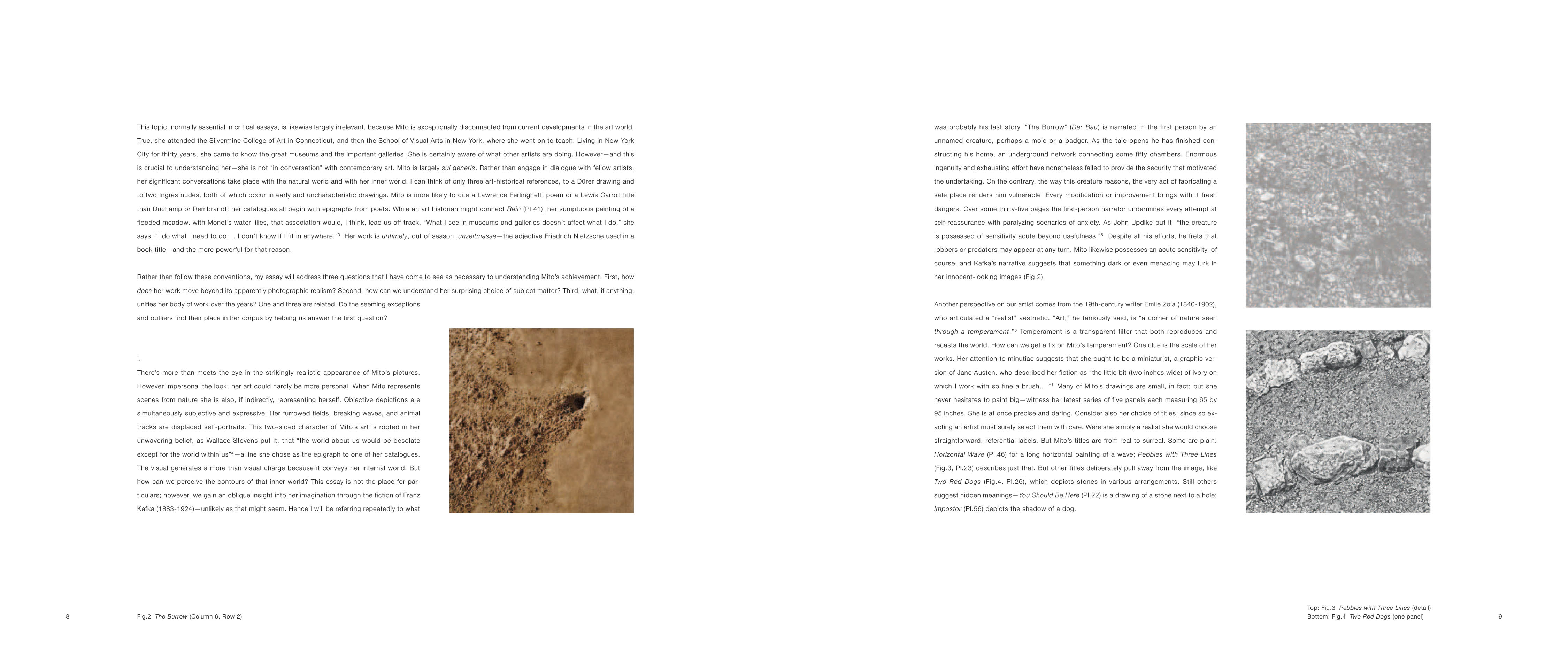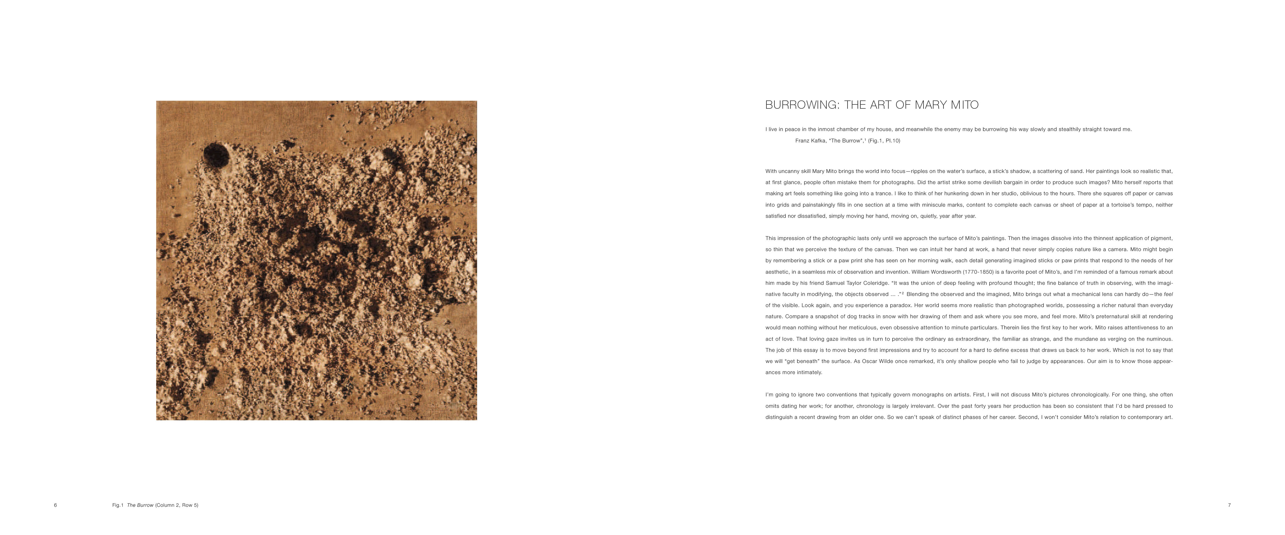 With uncanny skill, Mary Mito brings the world into focus—ripples on the water’s surface, a stick’s shadow, a scattering of sand. She convincingly renders sights that never call out to us, that we assume to be beneath our notice, like barren fields or animal tracks. What confers worth on such humble matter is her scrupulous and patient expenditure of attention. In Mito’s hands, extremes meet as mundane sites acquire mystery. She makes the rudest things eloquent. And because they are compelling to her, these things move us as well. She sees so that we may see.