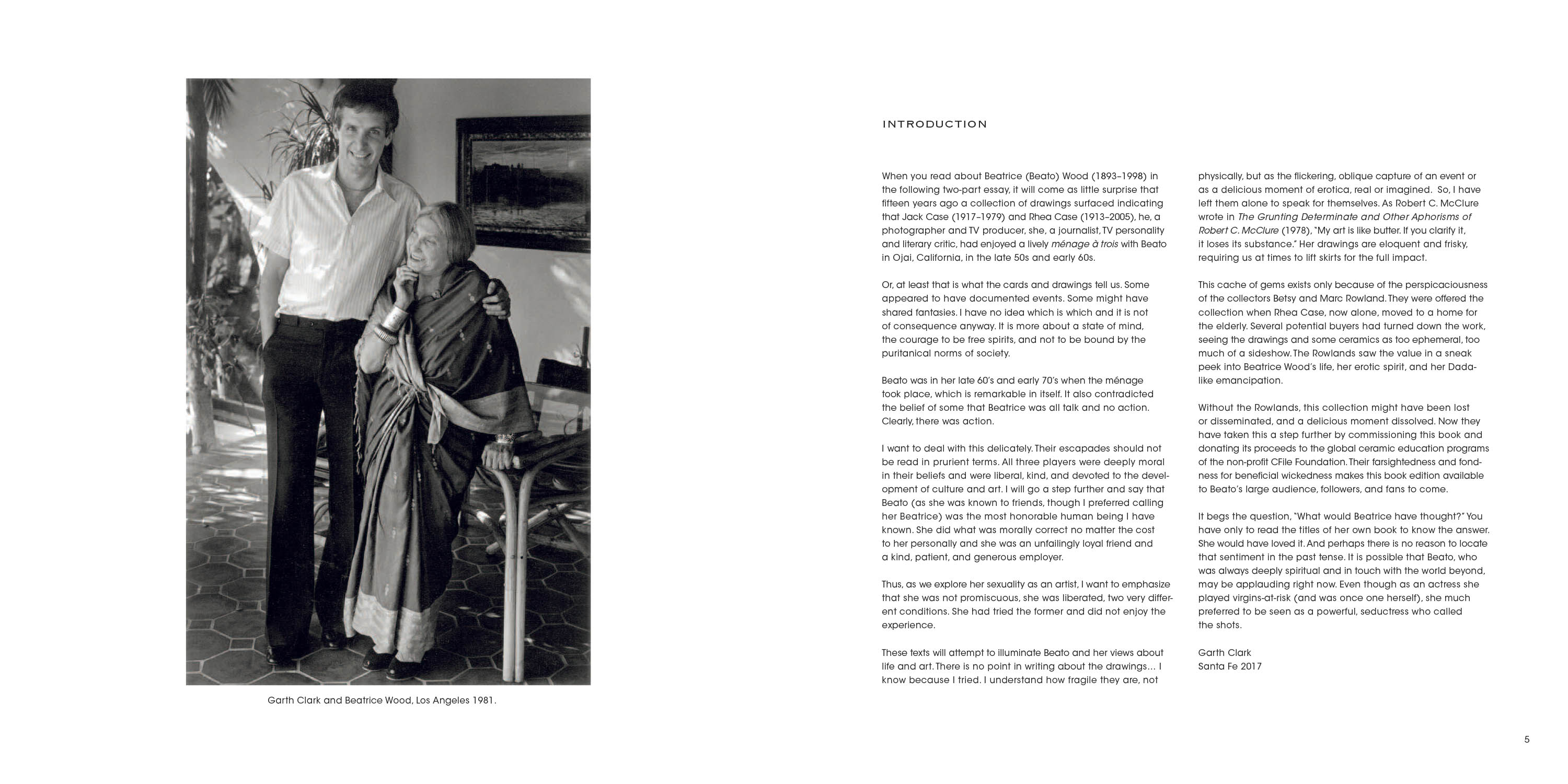 This book contains a collection of risqué drawings that document an intimate relationship she enjoyed with a married couple, Jack and Rhea Case, in Ojai, California, during the 1950s and 1960s. The collection was later acquired by Betsy Ross Rowland, who has sponsored this limited-edition book to benefit the ceramics educational programs of the nonprofit CFile Foundation.