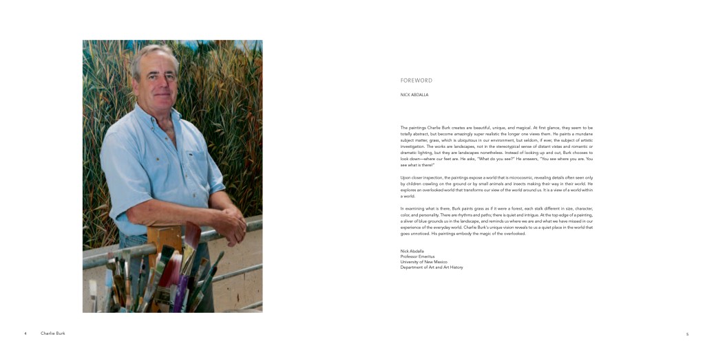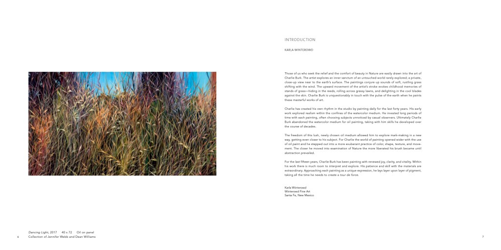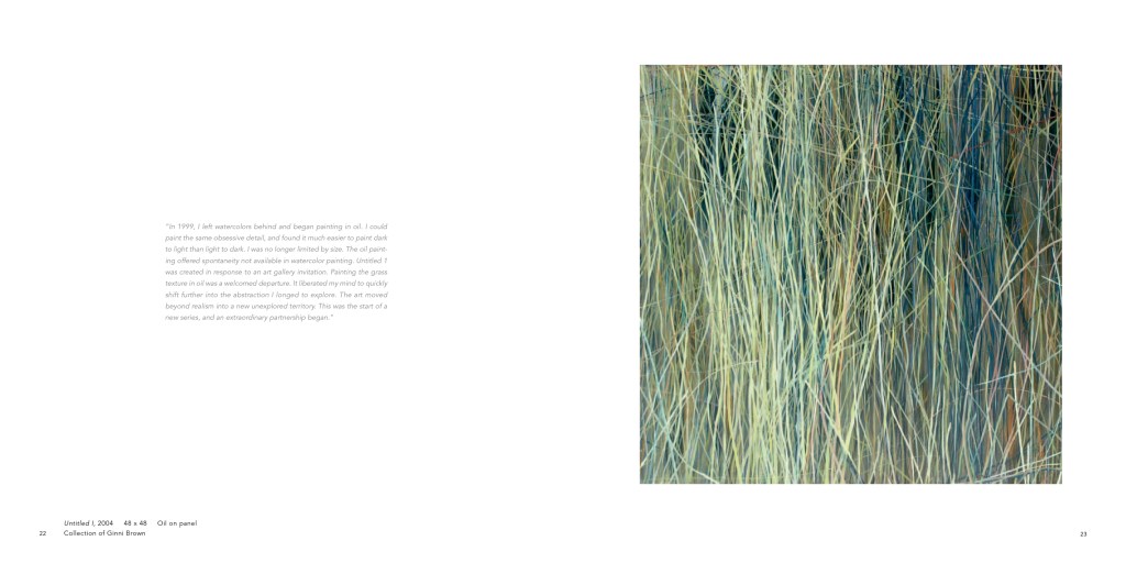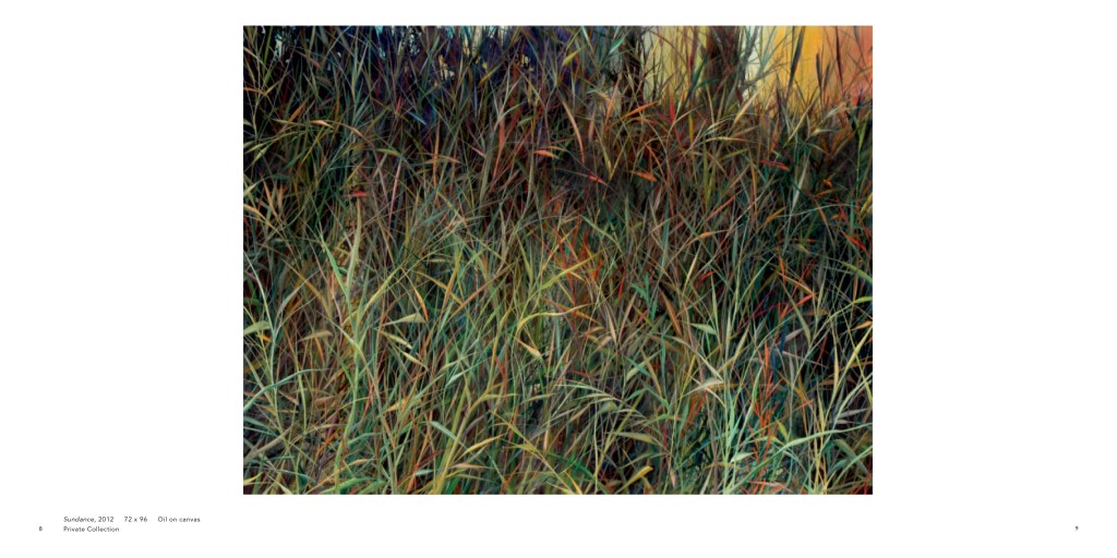 the art of Charlie Burk. His subject is clearly grass, with a horizon line or a slice of sky visible in many of his works as he moves in his world of sumptuous colors and delicate patterns. In a complex play of call-and-response, one brushstroke calls for the next. “What really interests me,” he says, “is the texture grass creates and the way it moves in space.” Another equally powerful pull is the visual beauty and the artistic journey it presents, that ever-fresh experience of dancing on the edge between abstract and representational art.