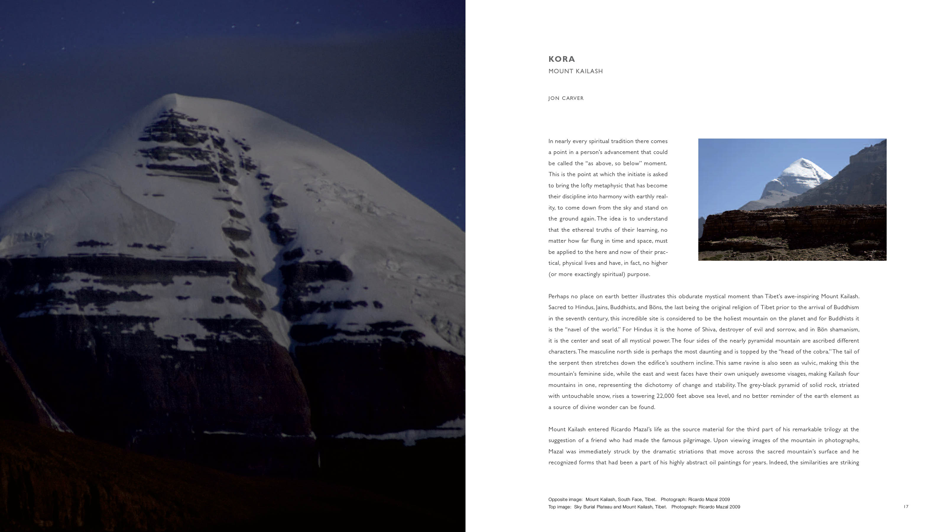 Mount Kailash in Tibet is the most venerated holy site on earth, the mountain at the center of the world for four religions, the source from which all creation sprung. In 2009 Mazal made a month-long journey to Mount Kailash and made a kora – a circumambulation of the mountain.