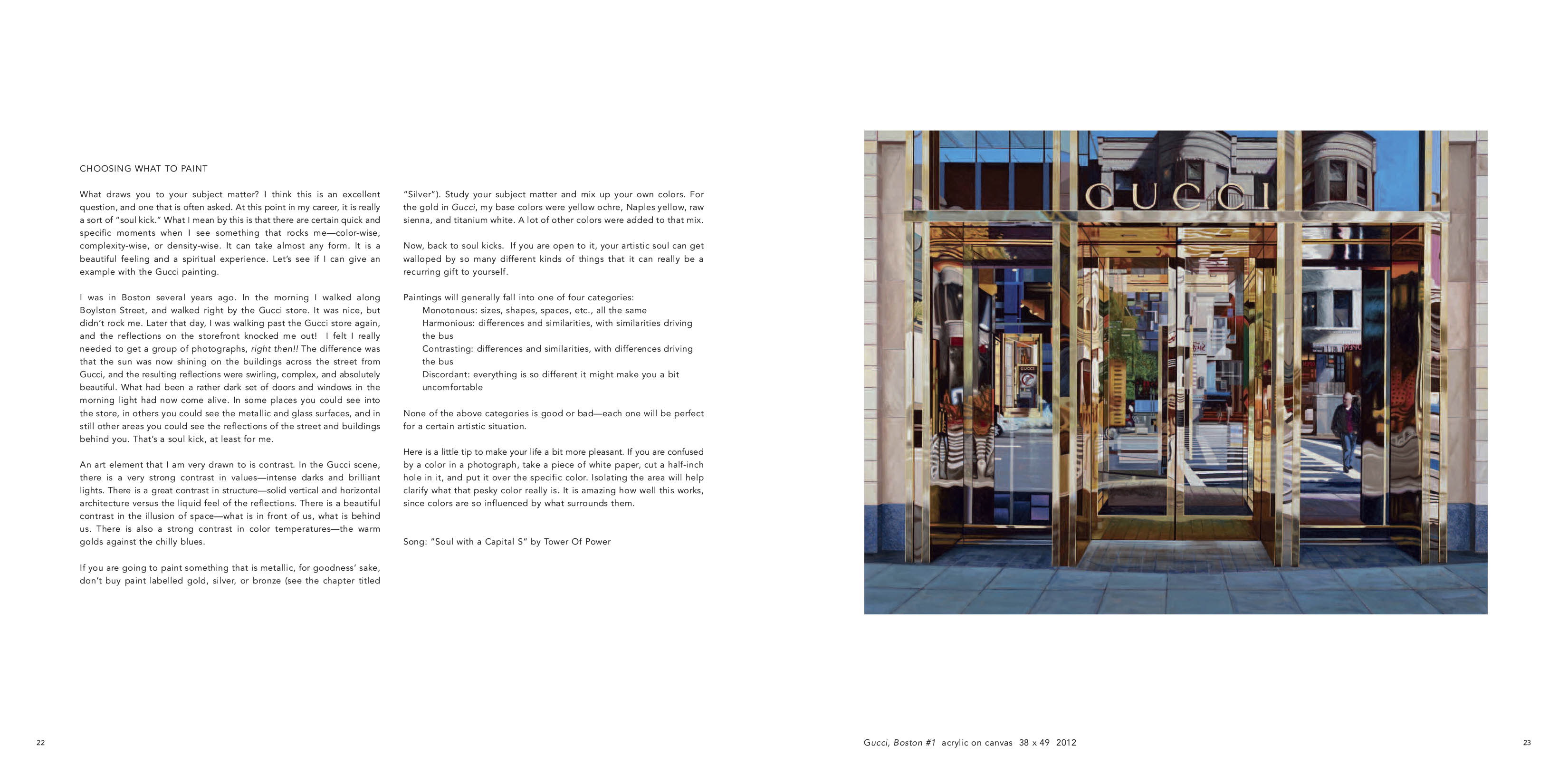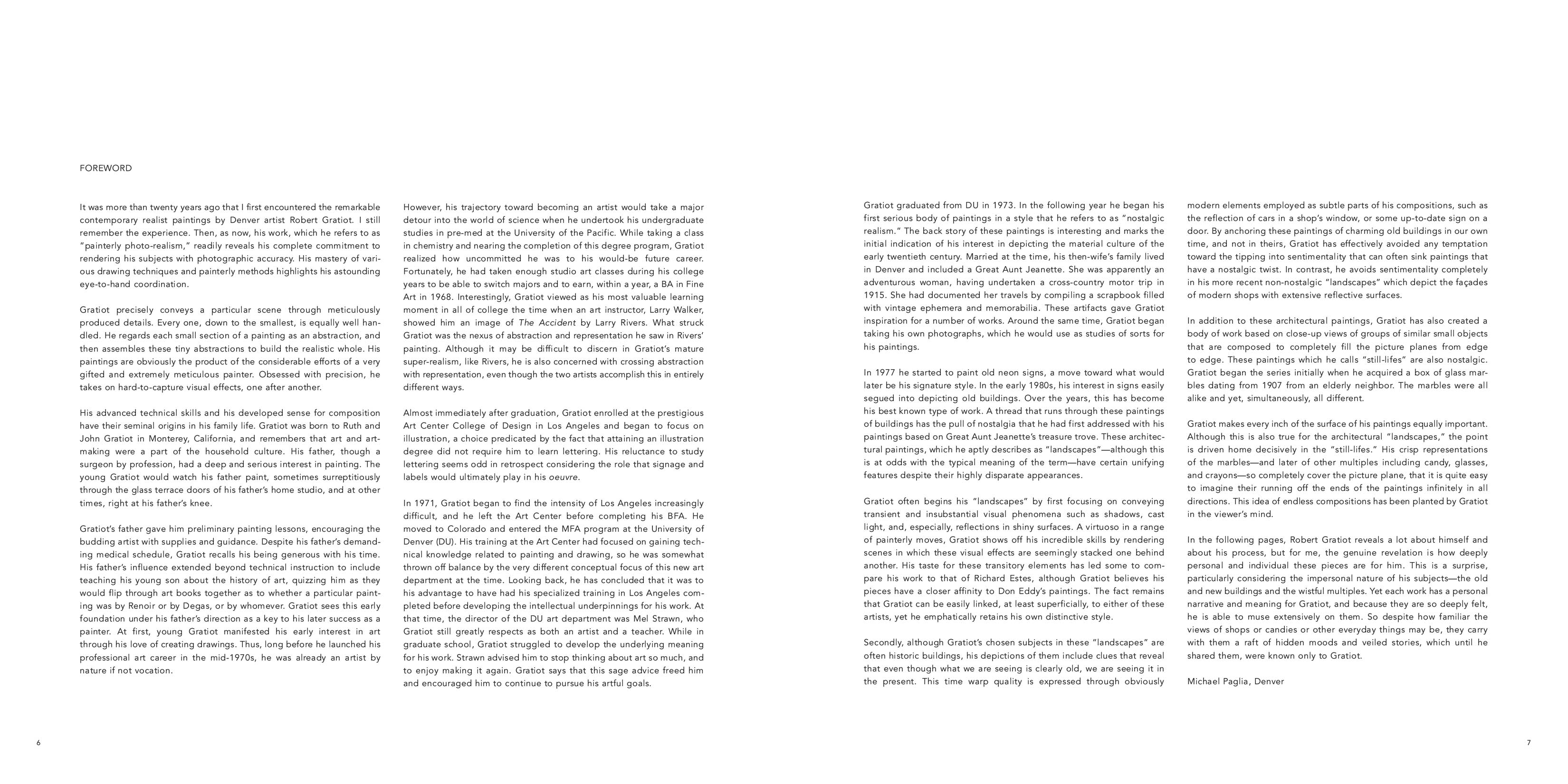 Artist Robert Gratiot refers to his work as “painterly photo-realism,” and he readily reveals his complete commitment to this reference by rendering his subjects with photographic accuracy. His mastery of painterly methods and of various drawing techniques highlights his astounding eye-to-hand coordination. Gratiot precisely conveys a particular scene through meticulously produced details, each down to the smallest, and equally well handled. But it is more than that— he regards each small section of a painting as an abstraction, and then assembles these tiny abstractions to build the realistic whole. His paintings are obviously the product of the considerable efforts of a very gifted and extremely meticulous painter.