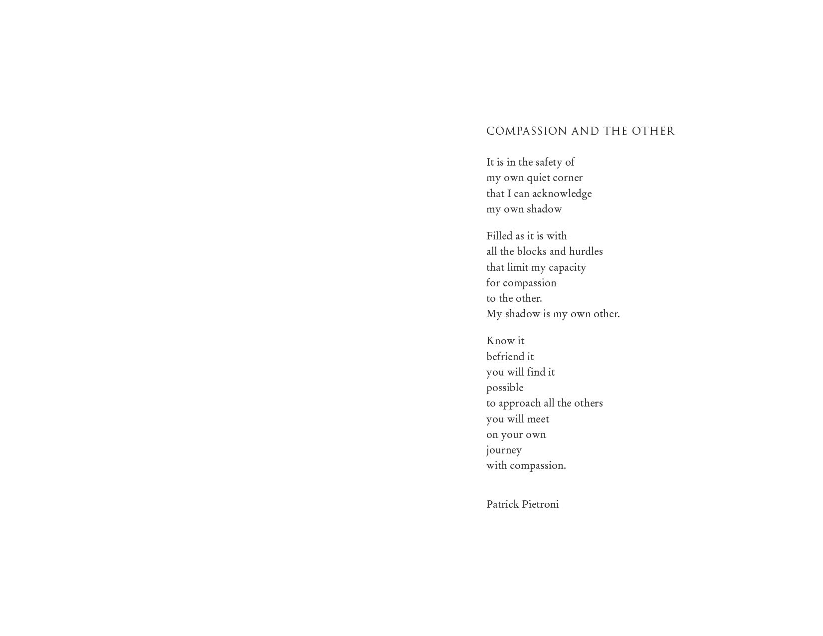 Compassion, a middle-English derivation from the Latin compati (to suffer with), has in our confusing and tumultuous times become a major academic discipline. Professor Patrick Pietroni brings together his work as the director of the Darwin International Institute for the Study of Compassion and his love of poetry to outline how the concept of compassion can emerge as a force for good in our conflicted world.